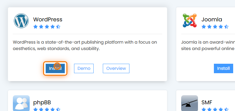 Zoek WordPress in de lijst met beschikbare applicaties en klik op de Install-knop.