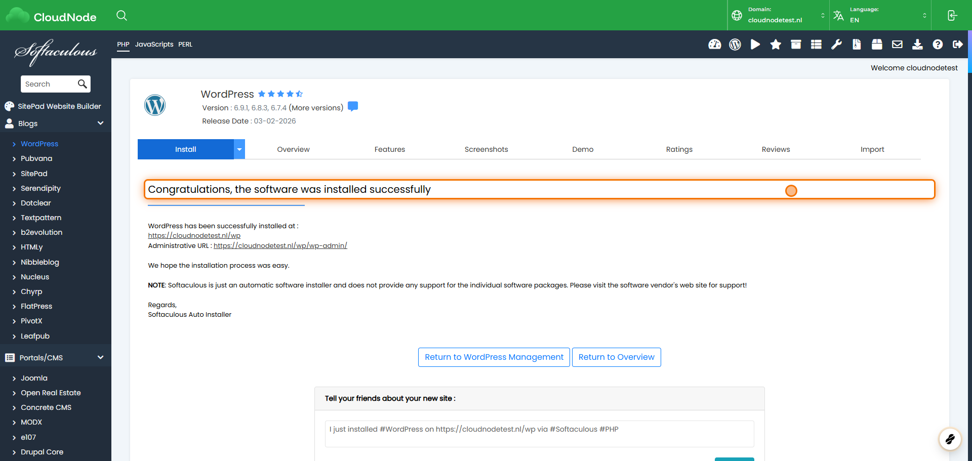 In dit artikel lees je hoe je WordPress installeert op je CloudNode hostingpakket via DirectAdmin. De installatie duurt slechts enkele minuten en gebeurt volledig automatisch.