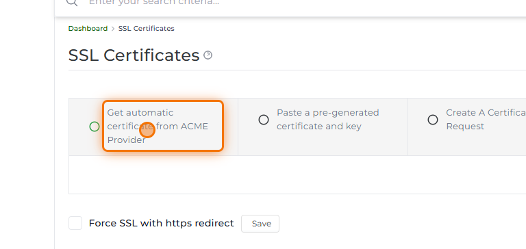 Klik op 'Get automatic certificate from ACME Provider' om een gratis Let's Encrypt SSL-certificaat aan te vragen.