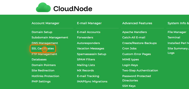 Log in op je DirectAdmin omgeving en klik op SSL Certificates in het hoofdmenu.Selecteer het juiste domein