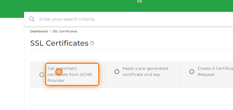 Klik op Get automatic certificate from ACME Provider. Dit activeert het automatische Let's Encrypt certificaat voor je domein.Sla de instellingen op